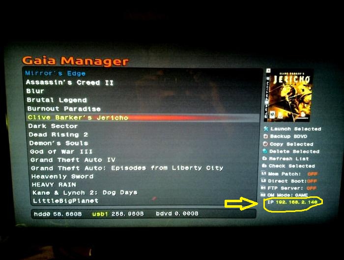 1. Deschideti managerul Gaia sau Multiman pe PS3. Pentru Gaia trebuie sa apasati R1 pe controller pentru a porni serverul FTP; la Multiman NU trebuie. Veti observa in partea dreapta jos a ecranului ca apare un camp cu IP. Acel ip puteti sa-l notati pe o hartie si mergeti la PC.